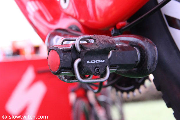 The Look pedals show signs of heavy use and tight cornering.