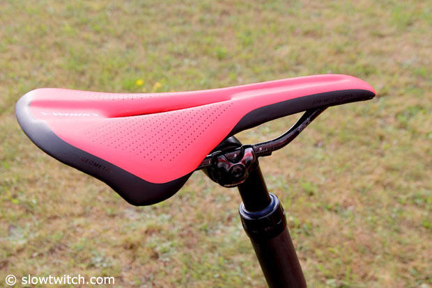The red saddle is a Specialized Phenom and the post below it offers 35mm of travel.