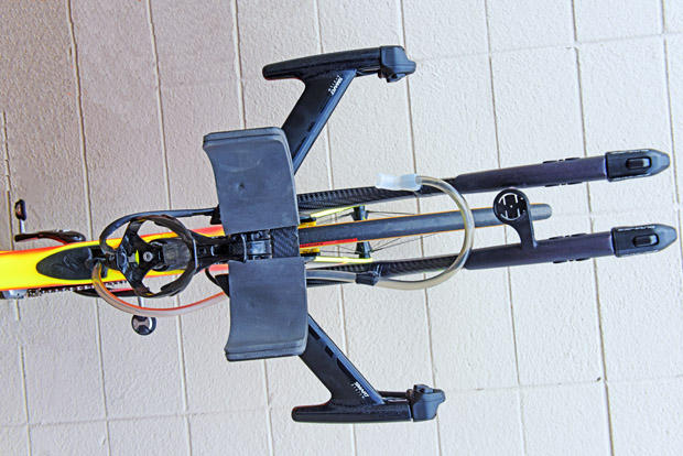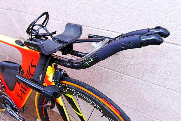 The front end uses Drag2Zero pads and arm rests, an ENVE base bar with aero-shaped Drag 2Zero extension poles made with Formula One grade carbon fiber. Armrest width is quite narrow, more like a bike racer than a triathlete.
