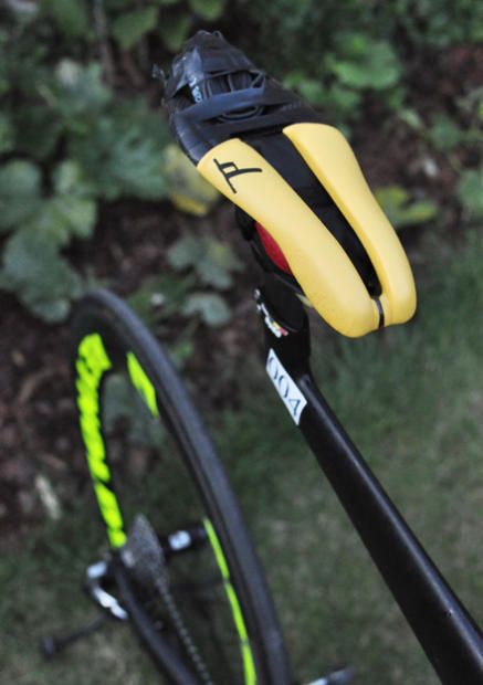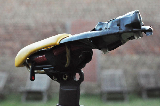 Gydé stores a tube above and a repair kit below, fastened with electric tape on the carbon hold behind the saddle. The saddle is a TT9 model with the integrated carbon piece.