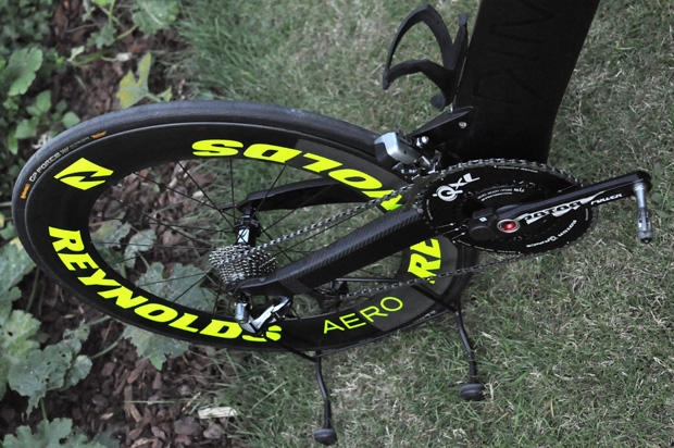 Reynolds wheels with a 24mm Continental GP Force in the back and a 22mm Attack up front. He uses 175mm Rotor power cranks and 54/44 Rotor QXL rings.