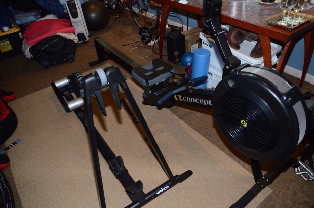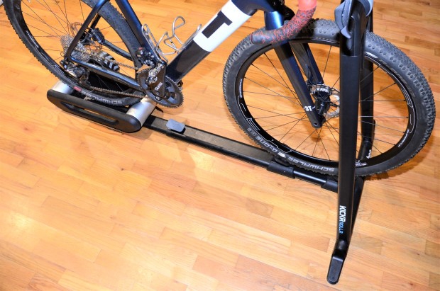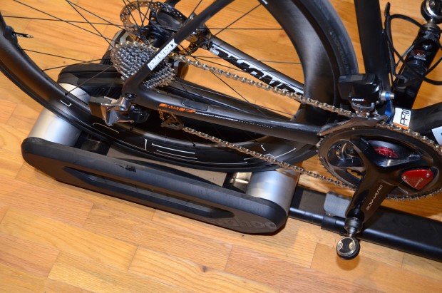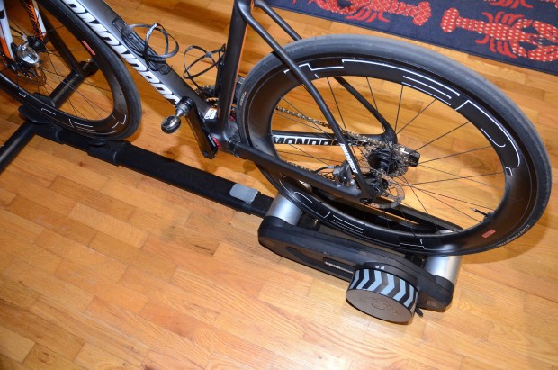 As easy as I found it to drive the ROLLR with my power meter, that paled in comparison to how easy it is to put a bike on the unit, and to switch between bikes. The resistance unit isn’t attached to the bike, it’s just a set of rollers that the rear wheel, well, rolls on, and the front wheel just sits in this tray…