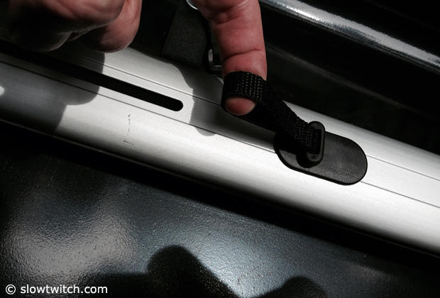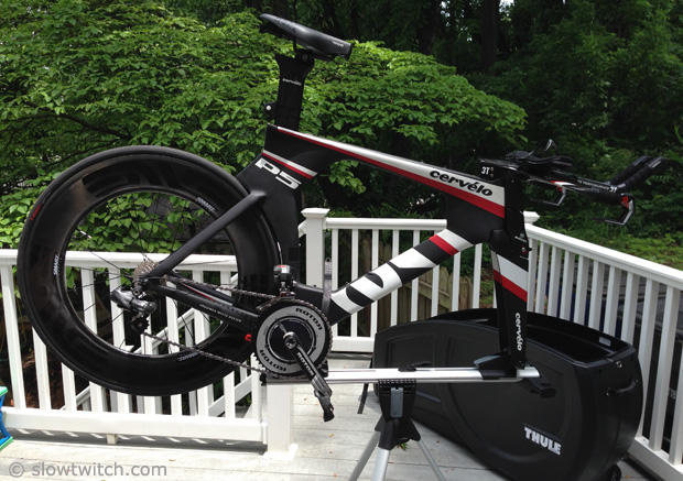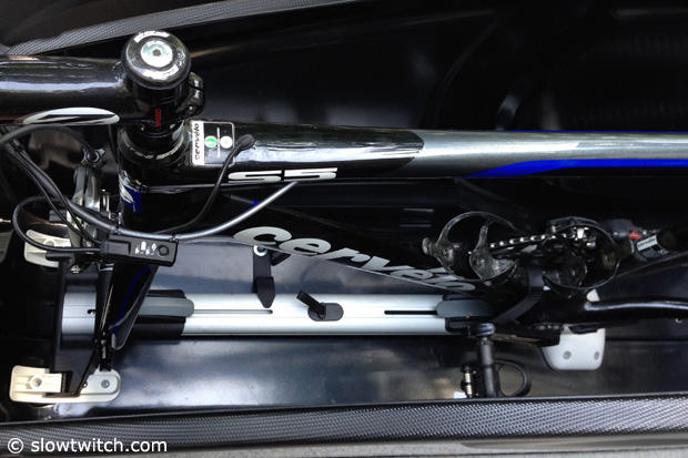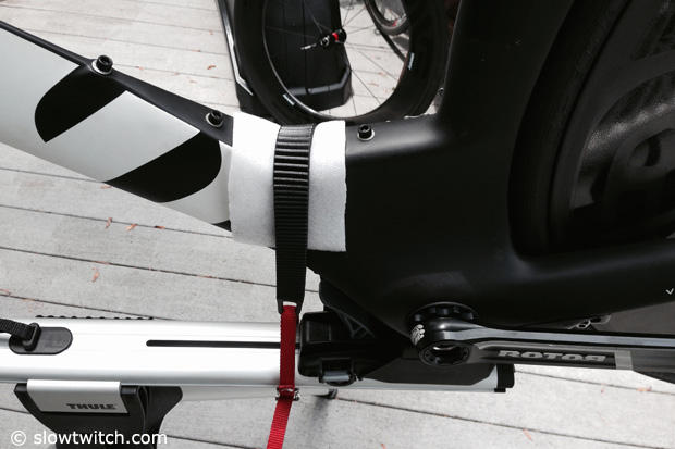 With the bottom bracket area so tall on the Cervelo P5 the strap that is stock inside the RoundTrip was not long enough. We helped ourselves with an old school toe strap that also serves as a mounting device on our roof rack when we run the deep ENVE SES 9 wheels. This problem however is not very likely on most road or TT bikes.