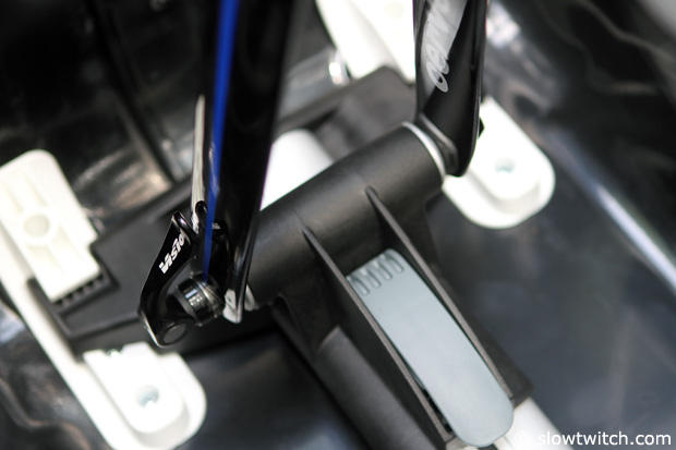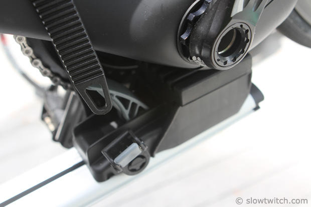 We had mentioned this earlier, it is very nice to have enough space to keep the pedals in place. As you look towards the bb area you will see the provided strap in place without additional assistance.