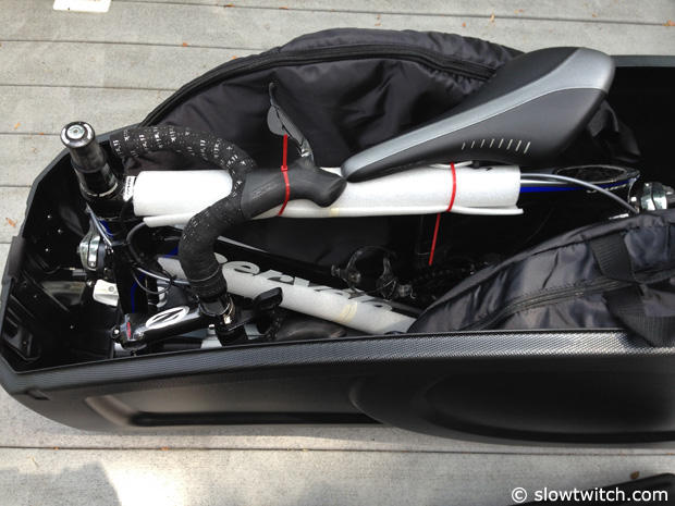 The RoundTrip is unique among travel cases with an included work stand that allows you to work on your bike wherever you travel, but also lets you pack up your bike on that work stand and then the whole affair, without the legs of course, just snaps in the bottom of the RoundTrip. This case is very voluminous and that allowed us the get the bike in without taking the pedals off, something that we well appreciated. We could have also just dropped the post a few inches and then not removed the seatpost and saddle, but that would scratch the carbon post and we thus refrained from doing so.