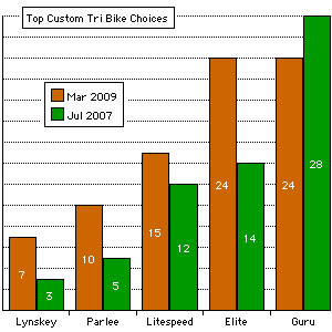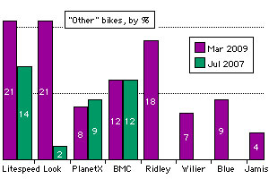 In both the 07 and 09 polls, we had an "other" category, for those whose favorite bike was not among those in the first poll. It seems, based on our polling, that the bigger brands might be consolidating their positions, if you place any stock in the fact that "other" received 20% of the vote in 09 versus 30% in 07. Still, there were some movers in the "other" category. Litespeed remains popular and even gains, perhaps because of the recent upscaling of the Blade and Saber. Ridley debuts in our poll at 18%, and Look, with the introduction of its well-conceived 596, leaps from 2% in 07 to 21% in 09. It shows you the difference a well-fitting frame makes. Look's 496 has plenty of advanced aero features and is a very sexy bike, but was a bust on our 07 poll. The 596 fits more athletes more of the time, hence its new popularity out of the gate.