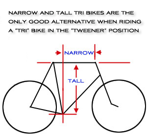 That established, I will not have convinced many riders and fitters out there, and the tweener positioned will still be employed. Knowing this, I offer two takeaways about this tweener position. First, if you must resort to this, don't try to do it with a Cervelo P3. "Long and low" tri bikes are just not made for the tweener. Best to just use a standard road bike; failing that a tri bike that's built narrow and tall. (There is a confluence in bike design, where narrow and tall tri bikes "look" geometrically like road bikes, as suggested by the yellow rectangle in the graphic adjacent.)