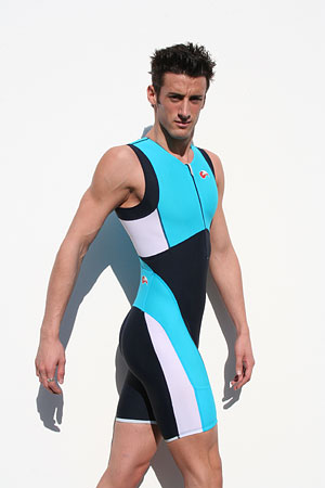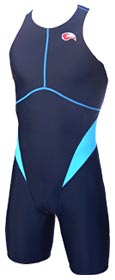 Kiwami makes triathlon clothing and nothing else. No bike shorts. No jerseys. No jackets. The only non-race apparel are men’s and women’s t-shirts, and a swim cap. Other than that, everything is triathlon specific apparel. The three suits they make are the long-course specific Kaiman, which has a slew of pockets, as well as both wider shoulders and a larger, slightly larger pad than the “universal” A-Suit. The A-Suit is a back-zip suit, with no pockets and a moderate sized pad that is Kiwami’s answer to the “basic trisuit.” Both it and the Kaiman are made primarily of Lycra. Both of these suits are very nice, but they are basically just very nice versions of something that we’ve all seen and worn before. Yes, the cut is nice. Yes, the stitching and colors are first rate. But basically, they are Lycra suits. What makes Kiwami really noteworthy is the pinnacle of their line – the Amphibian. This is the suit that the ITU athletes love (Female athletes can love their women’s “Wahina Max”).