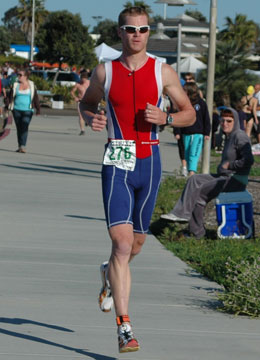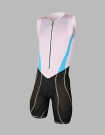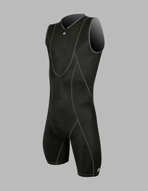 The Liftfoil is the newer of the two suits, and De Soto marketed it more as a swimskin than as a trisuit, but I actually think it's the nicer suit of the two. It's available in the full palette of Henry Ford colors – BLACK. It's made of 100% Liftfoil fabric and is designed for non-wetsuit swims. According to De Soto's website, "Liftfoil is a hydrodynamic fabric designed to be worn very tight. When stretched on a moving body, Liftfoil becomes thinner, so it absorbs less water. Because it compresses against the skin, it reduces passive drag, and acts as a foil to lift the body at the water surface." The fabric has a very smooth feel, making it quite comfortable to wear. The long inseam of the suit seems to eliminate the need for leg grippers, using the contour of your thigh to hold the suit in place. I found this worked very well, as the suit didn't ride up at all during cycling or running. The long inseam also meant that almost all of your upper leg is supported with some level of compression (depending on how big your thighs are). The suit pattern is very nice, with no seams at all across or near your waist. There's a pair of seams low across your groin (either side), which is what gives it the very supportive cut, but then it's a single panel up the whole front (and back) of the suit. The armpits receive a "rolled" border, so there is no seam at the armpit edge, an area of regular chaffing. Logoing is typically discrete, with a small De Soto dongle on the zipper and a small logo on the lower left thigh. In the water, the Liftfoil is extremely comfortable and fast. No water entered in under the arms, despite the fact that the suit has a nice cut around the chest and arms that doesn't feel like someone put your pectorals in a vise. When you reach up into the catch position, the stretch seals off the area under your arm, so no water will get in, but leaves that area very free during the pull phase. I was really impressed with how the suit felt swimming. The wide band of fabric at the shoulders meant there was no pull at all from the waist. Speedwise, I don't consider myself consistent enough to really evaluate these things. The Liftfoil is fast, certainly. Faster than anything else? I don't know. But it certainly holds it's own, and considering it is good all day, I think's it's an appealing option for non-wetsuit racing. The suit lacks any pockets, which may present a problem for long course racing, but there are a lot of good options for attaching things to race belts should you decide that this is going to be your trisuit of choice. The suit performs exceptionally well in all disciplines, which really makes it a pleasure to wear. The word from the folks at De Soto is that this is the preferred suit of many of the staffers. For late 2008, De Soto will be releasing a back-zip version of this suit to comply with the coming ITU mandate that age-groupers and pros both race with back-zip suits.