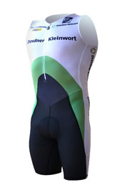 Now, given De Soto's custom options, if I was designing a suit, I'd ask for the following: I like the pattern of the Liftfoil, but I'd want to main back panels to be white. I also would prefer a back zipper, since I think they seem to put the suit in a better position in terms of not chafing your nipples, and they also look nicer, which is important for race photos! I'd also ditch the pad, and wear a swim-brief (aka speedo) underneath, since I find this to the most comfortable way to race. And, were I to ask for a custom suit, I'd have the comfort of knowing that I wasn't the first to do so. De Soto has a pretty impressive list of customers, including Normann Stadler, who purchased the suit seen here for his race at Ironman Germany.