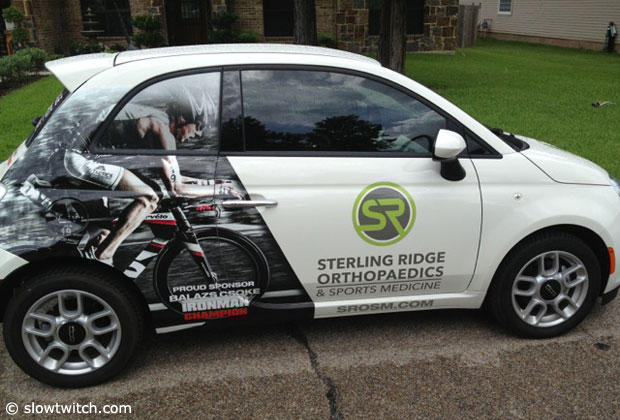 Our shuttle service was this catchy custom wrapped Fiat. Balazs claims to have fit three full bikes inside the back of this car.