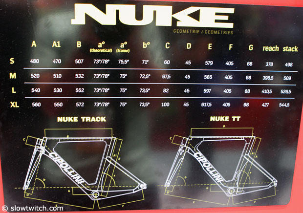 The Cipollini Nuke is a sharp looking machine but has a slack 75 degree seat angle.