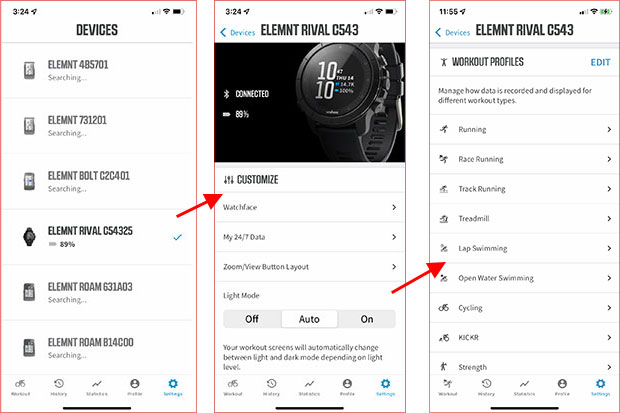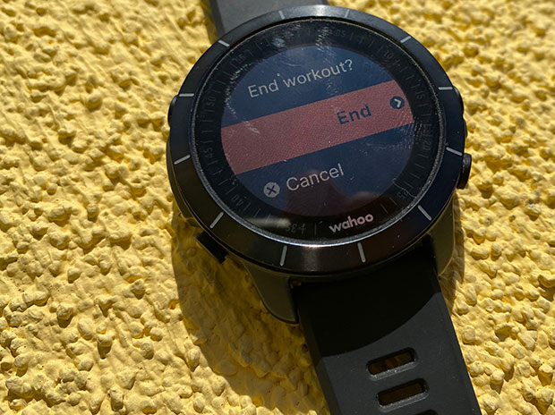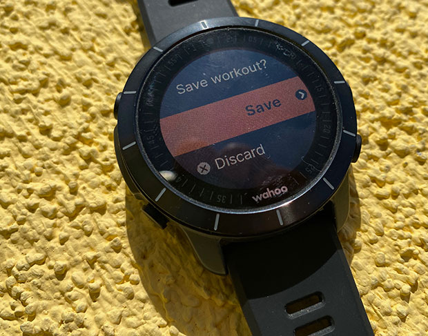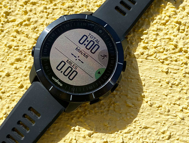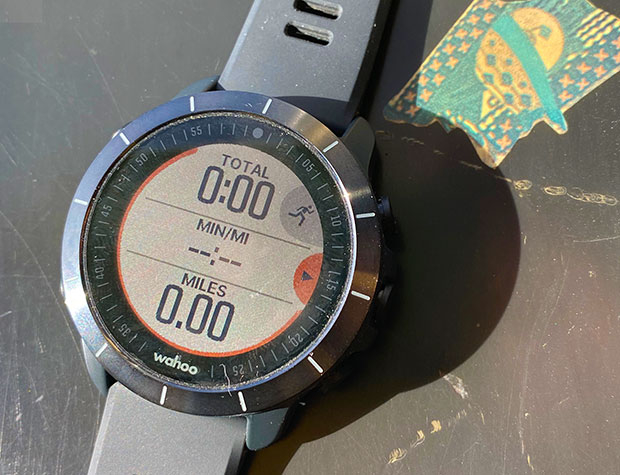 If I want to go on a run I hit one of those bottom buttons – left or right – and I’ll get to the Workout screen. What’s on that screen? Whatever I want to be on that screen because, just like the head units we ride with, you can have as many pages as you want, and whatever fields you want on each page. On my cycling Workout page it’s power, elapsed time, distance, speed, and on my Rival it’s elapsed time, distance, and minutes-per-mile. (If you look at that final ELEMNT app screenshot above you can see that I've deleted every metric on the Workout screen except these 3; and these 3 metrics are seen on the watch in the image just below.)