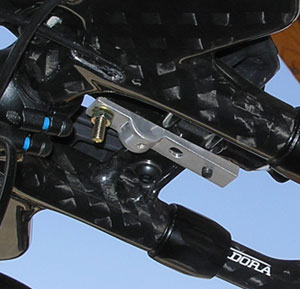 This bar has a little cross-piece, in front of the stem and between the extensions. Several bars have this, I don't know if it's primarily a structural thing or if it's there to mount your what-nots on. I chose to mount a what-not. If I'm going to ride an aero bike, I want to give the frame at least a fighting chance to be aero. So, I get all the bottles off of it. I like to place one bottle between the aerobars. Profile Design makes a piece to retrofit a Carbon X with a lower-profile armrest, and this piece worked very nicely as a mount that spans the underside of this Valdora bar's what-not hanger.