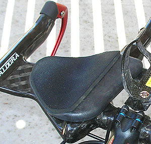 What first interested me when I initially saw this aerobar was its plush armrests. Valdora Cycles has done a great job of figuring out how to get the rider's forearm on top of a lot of surface area, while cutting off the back of the armrest into which your knee and mine would smack when we're out of our saddles. That said, the armrest trough is cantilevered, and I needed a little something to stiffen it up. Those little arc-shaped shifter fittings Shimano makes to put cable casing ends onto downtube shift bosses? After I ground off a little metal I slid one between the pursuit bar and each armrest. They physically can't come out of there, and it stiffened the armrests nicely.