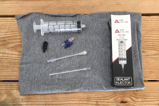 The injector we used is from KOM Cycling, a small US-based manufacturer of sealant tools, Garmin bike mounts, and other cycling accessories. Their system requires that you remove the valve core (using the supplied tool), and injects sealant through a thin straw that goes all the way down into your tire. We used the DT Swiss tubeless valves that come included with their ARC 1100 Dicut 62 carbon clincher wheels, injecting into 25mm Schwalbe Pro One tires.