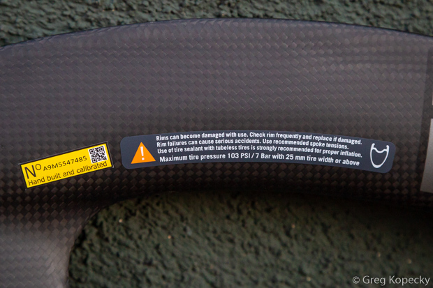 Vision did not provide us with a minimum, maximum, or recommended tire size, but a warning sticker on the wheel states a maximum tire pressure of 103 psi (7 bar) with a 25mm tire.