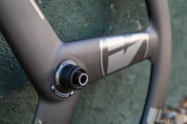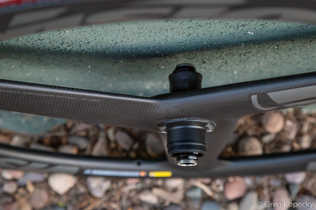 Our test wheel came with the Shimano Center Lock disc brake mounting system (their website also shows a 6-bolt version, though no available inventory). It’s interesting to note that you must unthread and remove the bearing preload cap in order to install your Center Lock rotor. Also note that it requires Vision’s lockring that’s specific to their axle design.