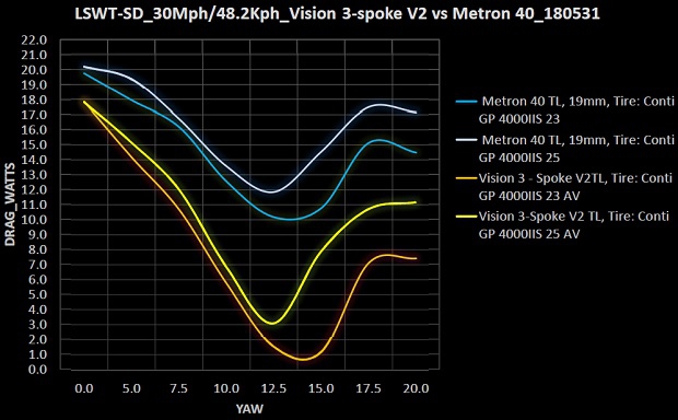 -Vision 3-spoke V2 with 25mm tire averaged 16.8sec faster than Metron 40 with 25mm tire.