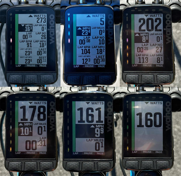 One of Wahoo’s unique features is its data page smart zoom. You can select up to 11 data fields per page and zoom in and out during a ride to see the level of detail that you want. (The BOLT has a maximum of 9 data fields.) You do not have to sacrifice – you can setup a screen with the main fields you want higher in the priority with extra fields if you zoom out. And the magic is that all the fields are legible thanks to the great display. The zoom views go from 11 fields in 6 lines down to one mega field. The trade-off is that Wahoo does not give you explicit control over the screen layout and data field position. But it is extremely easy to experiment in real time to tailor a screen exactly to your liking.