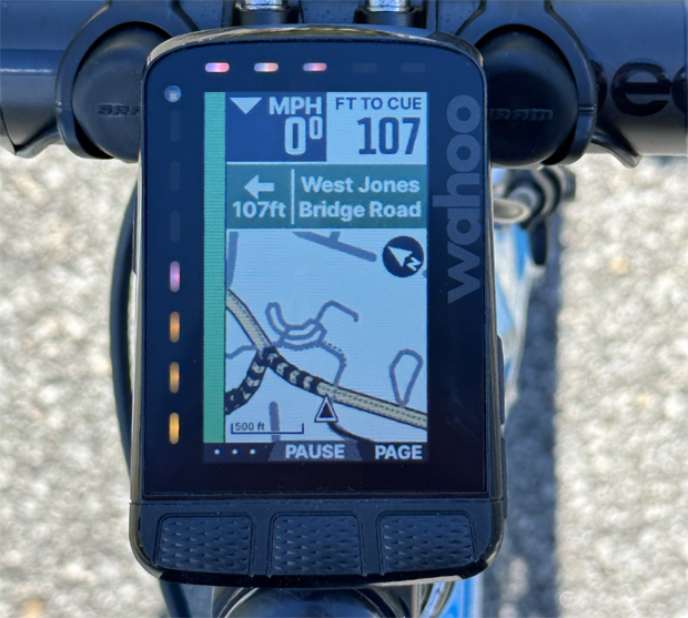 Wahoo’s other major exclusive cycling computer feature is the LED arrays above and beside the screen. The top LEDs show you turn directions, radar alerts, and notifications. The side LEDs are configurable to show speed, power, and heart rate relative to target or average. They give you excellent situational analysis at a glance. I set my side LED indicator to power, which is perfect for workouts. If I were racing, I would probably set it to power or HR, depending on the situation. It instantly communicates my effort without having to comprehend a number. Thanks to the top LEDs along with the graphics on the side of the screen, the Wahoo actually does radar better than Garmin units. The picture shows the top LEDs alerting me of a car in radar, and the right LEDs are showing that I am a little higher than my target power in the workout. (The pink-ish power LED is target, and the blue LEDs go up or down from there.)