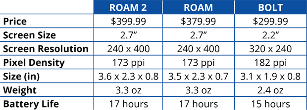 The new screen is 64 colors up from 8 on the old screen. (Another octuple if you are keeping track.) This fully enables color and gives it the same color data field capabilities as the BOLT – “color where it counts.” Finally, the ROAM 2 features USB-C charging to catch up with all the other cool rechargeable toys in town.