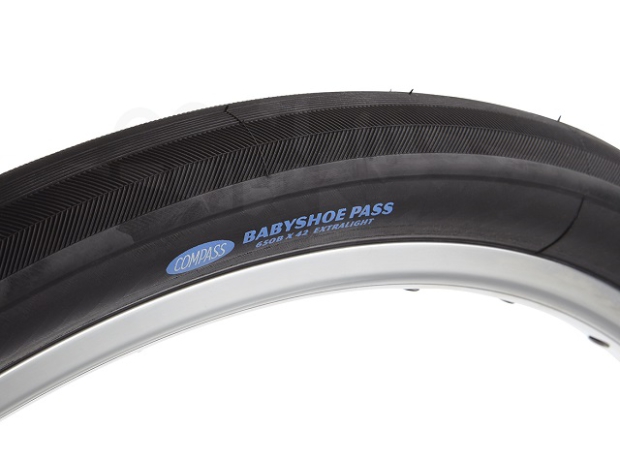 Let’s be clear – Road Plus is so new that there just isn’t a lot of tire rolling resistance data out there for the relatively few tire options (compared to 700c road tires). Therefore, there isn’t a lot to say aside from the fact that you can expect these tires to behave like other tires. Want something fast-rolling and light weight? A thin, flexible tire casing will get you there, at the expense of puncture protection. So far, the consensus is that the Compass 650b x 42 Babyshoe Pass TC with Extralight casing (pictured below) is the fastest roller out there, with the expected fragility. The WTB Horizon seems to be the “standard” tire right now, with a good balance of rolling prowess and puncture resistance. I’m also curious to learn more about the options from Teravail, though I’ve been unable to get response from their representatives as of yet.