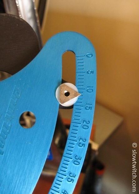 My Park dishing gauge has an adjustable block on either end. If you are checking your wheel’s dish with a tire still on it, adjust these blocks so that they contact ONLY the rim (not the tire). You do not want an imperfect tire to influence your dish measurement. If you removed your tire from the wheel, you can remove these blocks entirely.