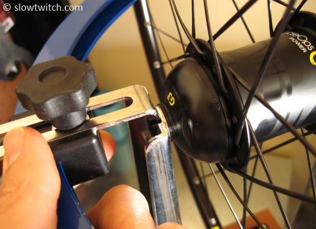 Next, put the dishing gauge on the other side of the wheel. If the dish is perfect, you will have exactly the same amount of space between the gauge and the lock nut. My wheel below is clearly NOT in dish (this was very early in the wheel building process):