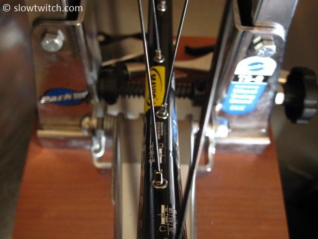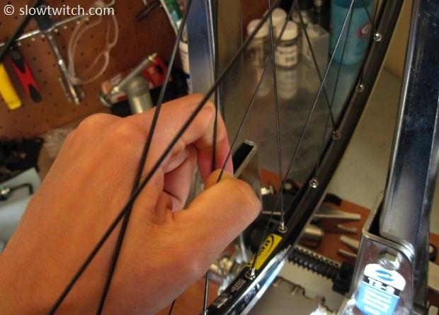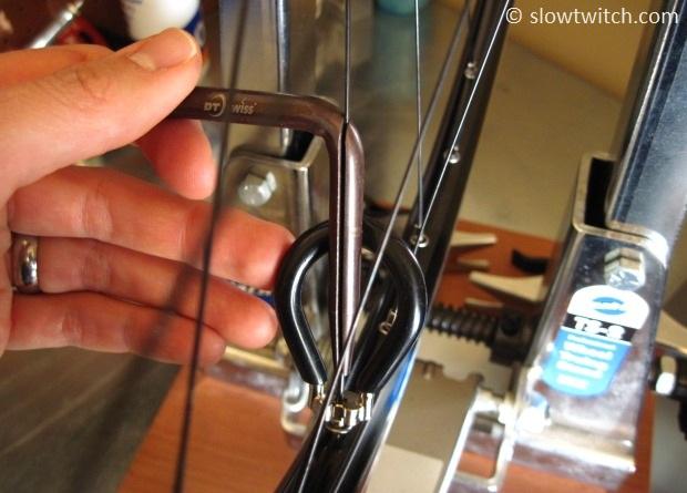 This keeps the blade part straight – not only is that more aerodynamic, but it also leads to better wheel longevity. As you turn the nipple, the spoke will want to turn with it. If you have round spokes, you cannot see this happening. In that case, I keep two fingers on the spoke itself to feel whether it is turning. I’ll also over-tighten each nipple by about 1/8th turn, and then turn it back 1/8th to undo any wind-up.