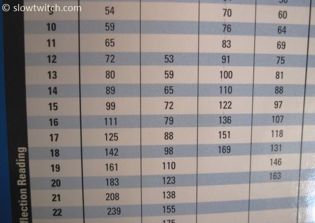 Looking down on the chart, the left column (in bold) shows the arbitrary units that show up on the tension meter itself. If you go over to your appropriate column, you see another number. That is the actual tension, in kilograms force (Kgf). If you prefer to talk in Newtons, one Kgf equals ten Newtons.