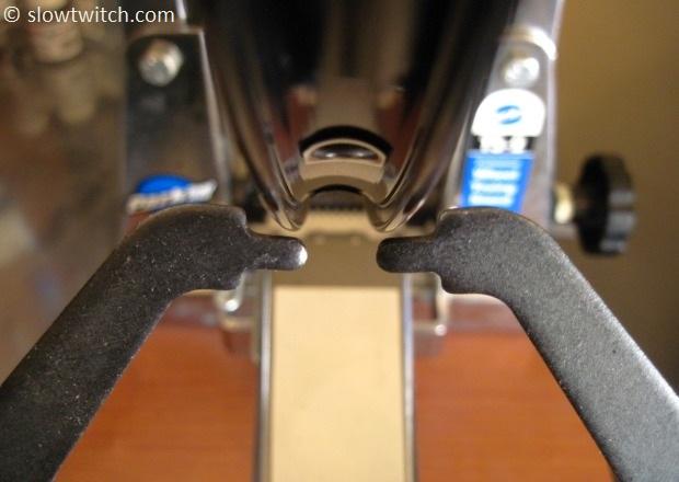 The Park TS-2 stand has an easy method for looking at the radial true of your wheel – bring the calipers together, and adjust them like this: