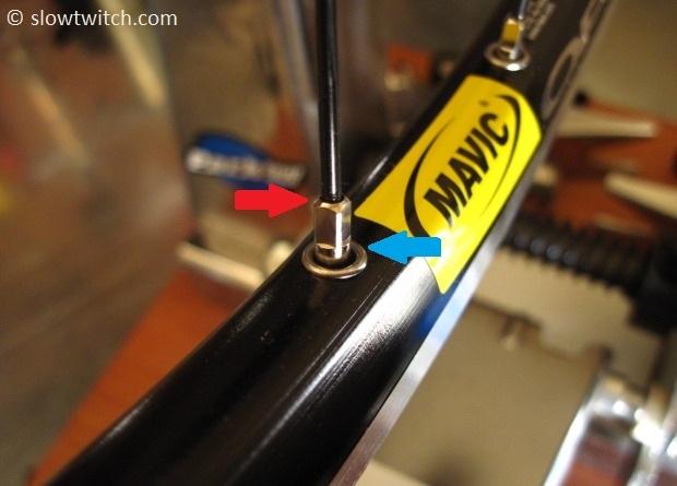 Whether or not you apply lubricant at the location of the red arrow (between the spoke and nipple) is a little bit more open to debate. Some manufacturers use various thread locking compounds after wheel assembly. Some do not. What I usually do is try to adjust a spoke nipple without lube; if it is easy to turn, I roll with it. If it’s difficult to turn, I add lube. If the manufacturer did something stupid like use a high strength Loctite on the spoke threads, I drench everything in lube; at that point, I’m just hoping to avoid breaking alloy nipples and getting myself in to a lot more work than I bargained for.