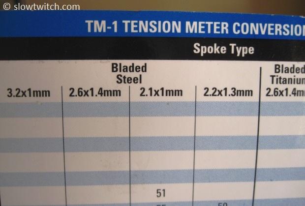 For my wheel today, I’m looking at the fourth column from the left on the chart above. The closest number to 120 Kgf is ‘122’. This is 15 units on the Park tension meter, so that is my target for the drive side of the wheel. If I was using a 2.0mm round spoke, the same 120 Kgf would net a meter reading of 25 (due to the much thicker spoke).
