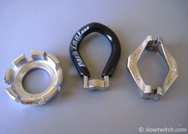 You will also need a spoke wrench. Be prepared, because there are at least a couple dozen different types out there. Here are a few of mine: