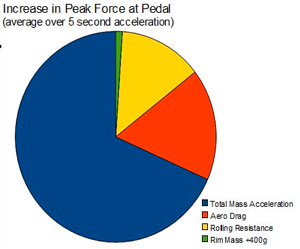 As can be seen in the pie chart to the left, the vast majority of the increase in peak force felt at the pedal was due to just linearly accelerating my (and my bike's) mass. Additionally, the increases in aero drag and rolling resistance accounted for approximately 1/3 of of the total increase in peak pedal force. The effect of increasing the rim mass of the wheels by nearly a full pound (400g) resulted in an increase in the average peak pedal force over the 5s acceleration of just 1%…in other words, an amount not likely to be "felt" at the pedals. It's pretty clear which areas of wheel performance the most benefit can be gained from making improvements: in the aerodynamics of the wheels and the rolling resistance of the tires and tubes applied to them.