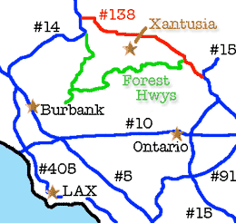 There are two ways around to the backside of the San Gabriel Mountains: over the #14 freeway "above" L.A., or over the #15 freeway "below" L.A. From LAX the quickest way is over the #14, which travels from the San Fernando Valley to Palmdale. From Orange County and points south the quickest way is over the #15 (Cajon Pass). From Ontario Airport the #15 is the way to go.