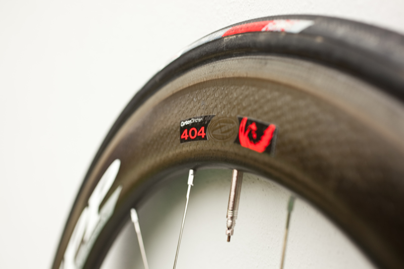 How about the ride? Are the wheels "comfortable"? Are they laterally stiff? Once I shod the wheels with the "good" rubber I outlined above, they were just as comfortable as any other wheelset I've used those types of tires on…in short, the tires make a bigger difference in comfort than any wheel or rim properties. And remember, the wheelset I was comparing the 404 CC wheelset to is basically a low profile aluminum rim with a carbon cap, which is a much less stiff configuration in the vertical direction. As for lateral stiffness, I never experienced any rubbing of the brake shoes when either sprinting out of the saddle or climbing steep grades. Cornering on these wheels was sure and devoid of any surprises. In short, they were easily "stiff enough" for use in bike racing.