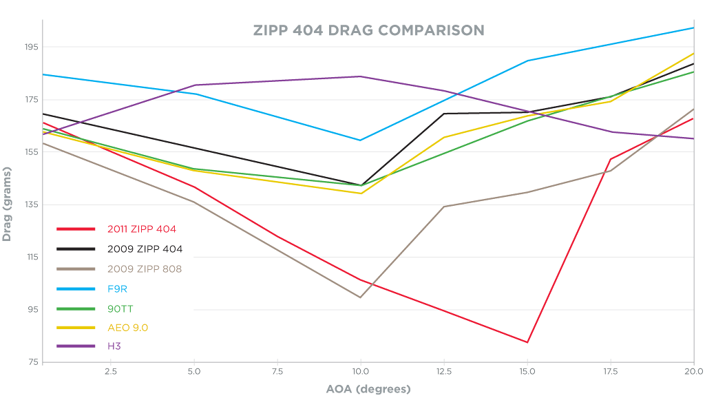 From 0 to 10 degrees of yaw, the old 808 and the Firecrest 404 are nearly tied, with the 808 "beating" it by less than 10 grams of drag, or the equivalent of approximately 1 watt of power at race speeds (or, probably within the margin of error of the measurements.) Above 10 degrees of yaw however, the new 58mm deep Firecrest 404 shape is significantly faster than the older non-Firecrest 808 (the wheel Cancellara rode to victory as described above). Another "nifty" accomplishment by the Zipp engineering team was the fact that the drag performance for both the clincher and tubular versions of the wheel are identical. This hasn't always been the case for particular wheel designs.