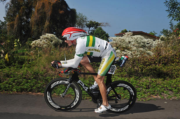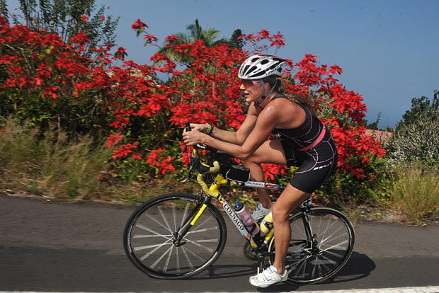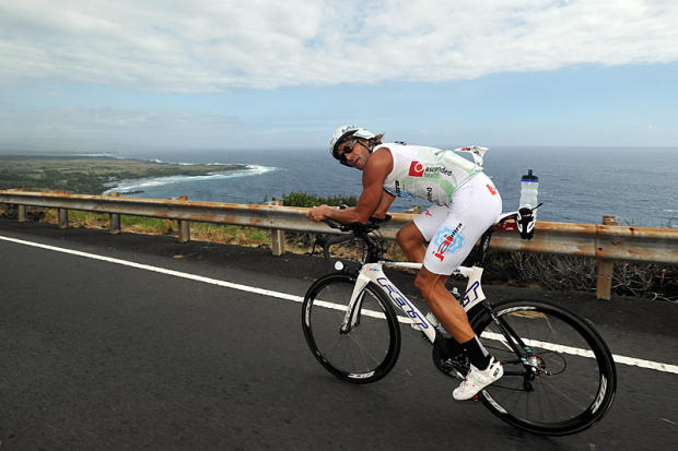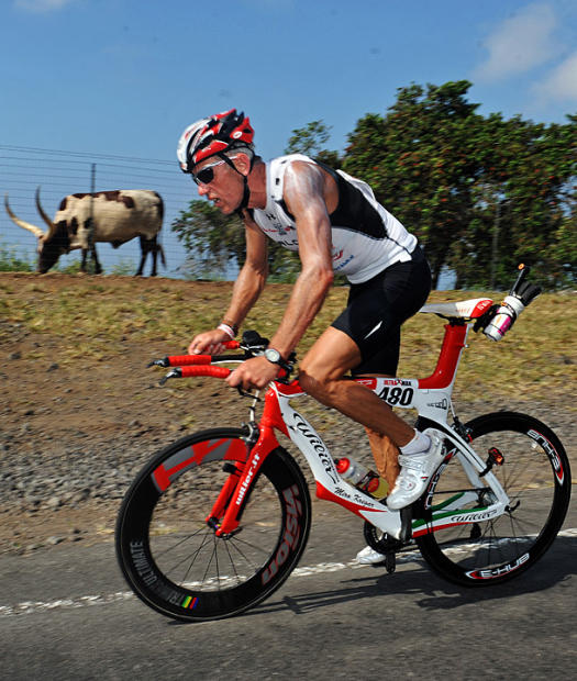 This post-Thanksgiving celebration of excessive aerobic activity embracing nearly all 12 climatic zones of the mysterious and beautiful Big Island of Hawaii begins in the dark on a Friday as less exceptional humans are revving up to go shopping. As kayaks and paddles and liquids and gels are lined up on Kailua Pier, this select crew of athletes put on high-tech neoprene suits that would pass for seal costumes on Halloween. There are hugs and smiles, but some faces, like Jochen Dembeck of Germany seen in a 1/6 of a second blur under orange lights, reflect the spirit's proper awe and dread of the 320-miles and the accompanying pain that lies ahead. Even at maximum effort, many swimmers are relieved to see a little boat crammed with photographers visit and give the appropriate chaka signs. The happiest swimmers are those blessed by a visit by pods of playful dolphins passing beneath. Some rookies happy just to finish the 10k swim take their time in the first and only Ultraman transition. Others, like 1997 champion Peter Kotland, chasing a new chapter in history take less time. On the way to Volcanoes National monument 90 miles to the south over 7,600 feet of climbing, riders pass 1940s style wooden theaters, gorgeous passionately colored flowers, Longhorn cattle, lava and breathtaking vistas at South Point. When they arrive at the cool rain forest climate of Volcanoes 90 miles later, top finishers congratulate one another, the one defending champion kisses another, and one woman cries with relief for making the 12-hour cutoff by 10 seconds.