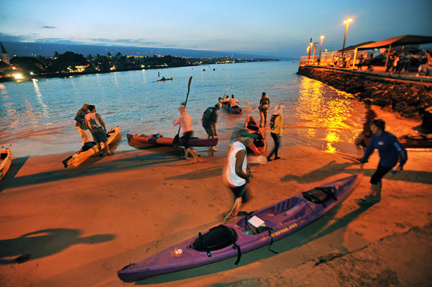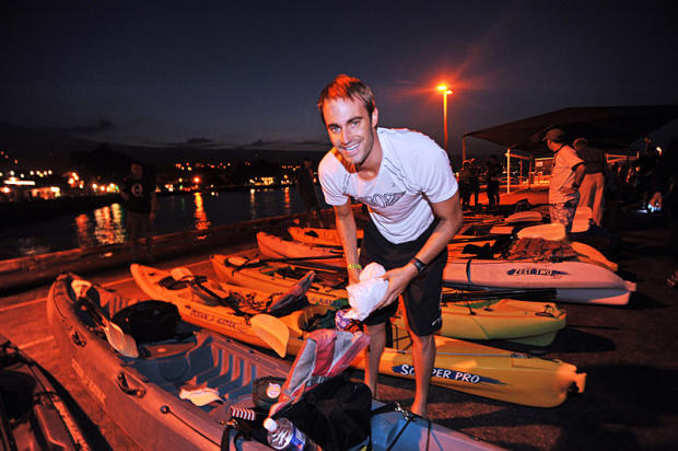 Matt Davie, a former varsity swimmer for Stanford, is preparing the support kayak for Team Night Rider's Vito Bialla, who will do the swim. Vito's wife Linda, the 1999 Ultraman champion, will do the bike, and Davie will soldier through the 52.4-mile run.