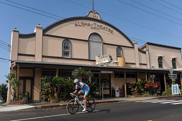 Jochen Basting rides past the Aloha Theater, 15 miles past and 1,500 feet above the bike start at Jeauhou.