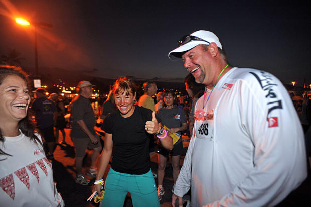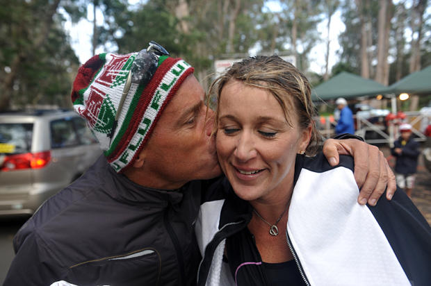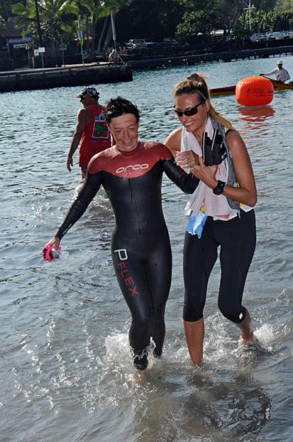 Ultra running star Ann Heaslett, who finished second in her 2007 Ultraman debut, laughs as crew member puts on some lubricant to her wetsuit collar.