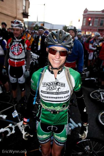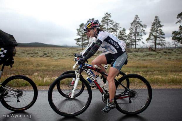 Rebecca Rusch riding with the front men, or maybe the front men riding with Rebecca Rusch?