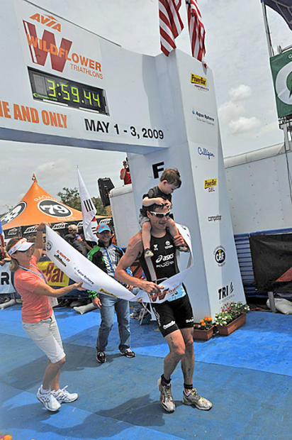 Andy Potts, with son Boston on his strong shoulders, celebrates his win with the third fastest time in Wildflower history – 3:59:41