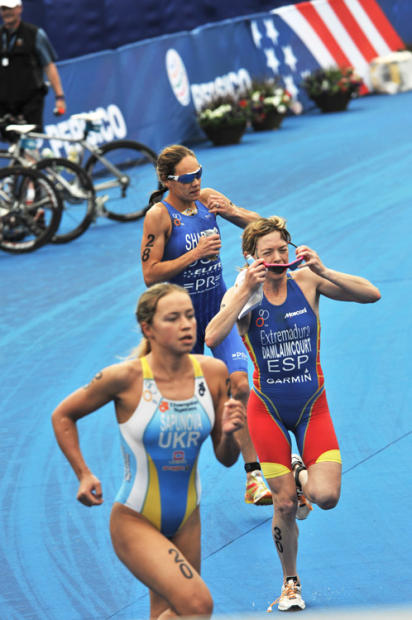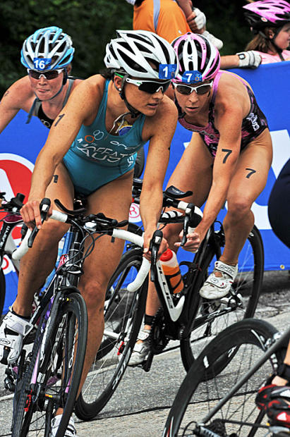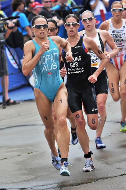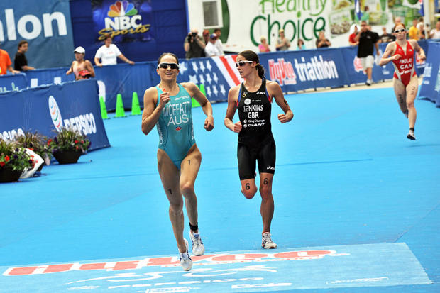 This year’s finish line sprint – 2009 World Championship Series champ Emma Moffatt tops 2008 ITU World Champ Helen Jenkins by a second.
