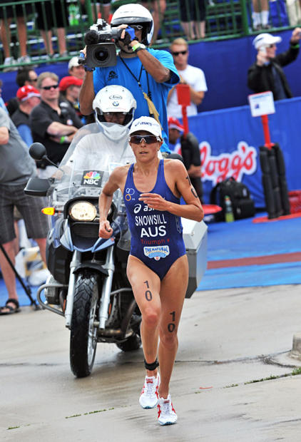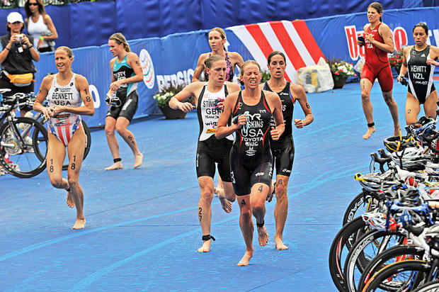 Sarah Haskins grits her teeth coming out of T2 on her way to a disappointingly off-form 16th overall and a 38:15 run.