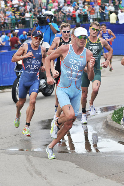 The men, led by Jan Frodeno and Kris Gemmell, arrive in T2 ready for the real race to begin.