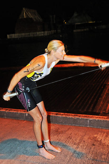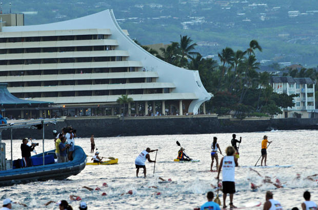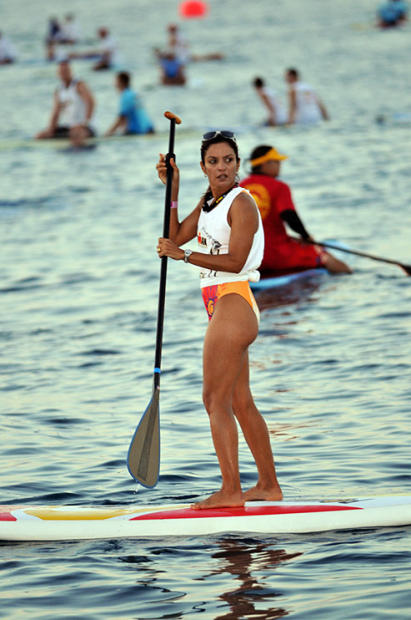 Six time Ironman Hawaii third place finisher Fernanda Keller of Brazil offers her stand up paddling services to guide the swimmers.