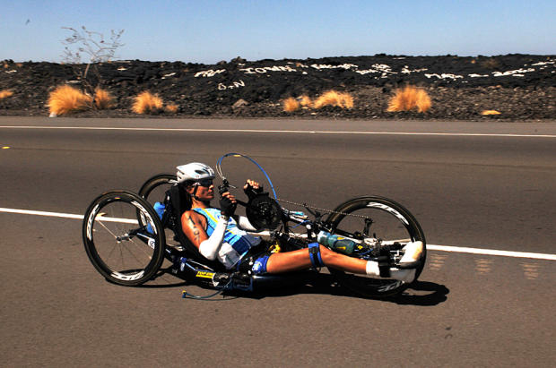Tricia Downing races her handcycle on the Queen K.